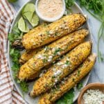 Store leftover corn ribs in an airtight container in the refrigerator for up to 2 days. Reheat them in the air fryer at 350°F for 3-4 minutes to restore crispness. Keep the Elote sauce separate and add fresh before serving.