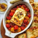 This baked feta with tomatoes and garlic is a simple yet flavorful dish perfect for any occasion. Creamy feta cheese bakes alongside juicy cherry tomatoes, garlic, and aromatic herbs, creating a warm and inviting appetizer. Serve it with honey-drizzled focaccia for a delightful dipping experience.