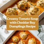 A comforting and hearty tomato soup enhanced with flavorful cheddar bay biscuit dumplings. This recipe combines a smooth tomato base with cheesy, buttery dumplings that cook right in the soup, creating a deliciously satisfying meal perfect for any season.
