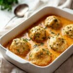A white rectangular baking dish filled with six round, golden-brown dumplings sitting in a rich, orange creamy sauce. Each dumpling is slightly textured with a soft crust and sprinkled with chopped green herbs on top. The sauce around the dumplings is smooth with a shiny surface, covering the base of the dish evenly. The dish is placed on a beige cloth over a white marbled texture table with a spoon visible next to it and blurred greenery in the background. photo taken with an iphone --ar 4:5 --v 7