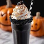 Keywords: black milkshake, black cocoa powder milkshake, chocolate milkshake, vanilla ice cream milkshake, whipped cream topping, black sanding sugar rim