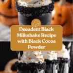 This decadent Black Milkshake features a rich blend of vanilla ice cream, black cocoa powder, and maple syrup for a uniquely dark and creamy treat. Finished with a homemade whipped cream topping and an optional black sanding sugar rim, this visually striking milkshake is perfect for impressing guests or indulging in a fun, flavorful dessert.