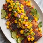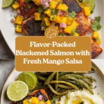 Keywords: blackened salmon, mango salsa, spicy salmon, healthy seafood recipe, quick dinner, cast iron skillet salmon