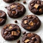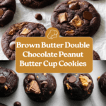 These Brown Butter Double Chocolate Peanut Butter Cup Cookies combine the rich nuttiness of browned butter with deep chocolate cocoa and melty peanut butter cups. Soft, fudgy, and packed with chunks of chocolate and peanut butter candy, they are an indulgent treat perfect for chocolate lovers looking for a deluxe cookie experience.