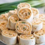 Keywords: Buffalo chicken, pinwheels, appetizer, party food, easy snack, buffalo sauce, cream cheese, shredded chicken