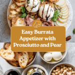 A simple yet elegant Burrata Appetizer featuring creamy burrata cheese paired with sweet and savory accompaniments like ripe pear slices, prosciutto, dates, and a drizzle of balsamic glaze. Served with petite toasts or pita chips and garnished with marcona almonds and fresh basil, this appetizer is perfect for entertaining or a light snack.