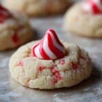 Candy Cane Kiss Cookies are festive sugar cookies infused with a hint of peppermint and decorated with crushed Candy Cane Kisses inside and a whole Candy Cane Kiss pressed into the center right after baking. These soft, slightly crumbly cookies are perfect for holiday celebrations, offering a delightful combination of buttery sweetness and minty chocolate flavor.