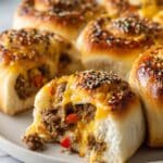These Cheeseburger Pinwheel Pizza Bites combine the savory flavors of classic cheeseburgers with cheesy pizza in a fun, bite-sized roll. Ground beef cooked with onions, garlic, tomatoes, and spices is spread over pizza dough, rolled into pinwheels, and baked to golden perfection. Topped with melted cheddar cheese and a sprinkle of sesame seeds, these pinwheels make an irresistible appetizer or snack perfect for parties and family gatherings.