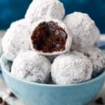 A light blue bowl filled with round chocolate cake balls covered in a thick layer of white powdered sugar, one cake ball cut in half and placed on top to show the dark brown, soft, and moist chocolate inside with small chocolate chunks embedded in it, all set on a white marbled surface. photo taken with an iphone --ar 4:5 --v 7