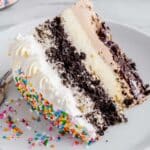 This Copycat Dairy Queen Ice Cream Cake recipe replicates the beloved fast-food dessert, featuring layers of chocolate and vanilla ice cream, a crunchy chocolate cookie crumb base, decadent hot fudge, and a fluffy whipped cream frosting finished with colorful sprinkles. A perfect no-bake frozen treat that combines creamy, crunchy, and chocolatey elements for an indulgent dessert experience at home.