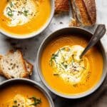 Three gray bowls filled with bright orange soup sit on a white marbled surface. Each bowl holds creamy soup topped with a swirl of white cream, sprinkled with green herbs and black pepper. In one bowl, a silver spoon rests on the edge. Around the bowls, pieces of crusty brown bread are scattered. The soup looks thick and smooth with a rich texture. photo taken with an iphone --ar 4:5 --v 7