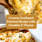 Classic Scalloped Potatoes made with thinly sliced potatoes baked in a creamy cheese sauce infused with thyme and garlic. This comforting side dish features layers of tender potatoes covered in a rich, cheesy sauce, perfect for holiday dinners or family meals.