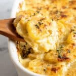 Classic Scalloped Potatoes made with thinly sliced potatoes baked in a creamy cheese sauce infused with thyme and garlic. This comforting side dish features layers of tender potatoes covered in a rich, cheesy sauce, perfect for holiday dinners or family meals.