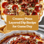 This Creamy Pizza Layered Dip is a delicious and hearty appetizer that combines creamy cheese layers with savory pizza flavors. Featuring a base of cream cheese, sour cream, and herbs, layered with tangy pizza sauce, Italian sausage, mozzarella, pepperonis, and bacon bits, this dip is baked to bubbly perfection and perfect for parties or game day snacks.