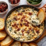This Creamy Tuscan Dip is a warm, cheesy delight perfect for parties or cozy nights in. Made with a blend of cream cheese, sour cream, mozzarella, and Parmesan, it’s infused with garlic, Italian seasoning, sun-dried tomatoes, and spinach for a rich, savory flavor. Baked until bubbly and golden, it pairs wonderfully with bread or crackers.