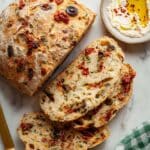 - Mix Dry and Add-Ins: In a large bowl, whisk together bread flour, yeast, salt, sugar, oregano, basil, garlic powder, and crushed red pepper flakes if using. Add chopped pepperoni, sun-dried tomatoes, olives, and shredded mozzarella cheese. Gently combine.