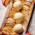 This Easy French Apple Tart, or Tarte Fine aux Pommes, is a delicate and elegant dessert featuring thinly sliced Gala apples arranged atop a buttery puff pastry base. It combines a crisp, flaky texture with the natural sweetness of baked apples, finished with a light dusting of powdered sugar and served warm alongside creamy vanilla ice cream for the perfect balance of flavors and textures.