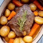 - Plate: Remove the roast and vegetables carefully onto a serving platter. Discard the rosemary and thyme sprigs. Cover with foil to keep warm.