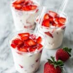 There are clear plastic cups filled with a creamy white yogurt mixed with red strawberry pieces inside. The yogurt has scattered red strawberry chunks throughout, and on top of each cup, there is a red strawberry slice. A clear plastic spoon rests inside each cup. The cups sit on a white marbled surface, with fresh whole strawberries placed beside them for decoration. Photo taken with an iphone --ar 4:5 --v 7