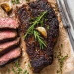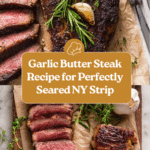 Keywords: garlic butter steak, NY strip steak, pan-seared steak, garlic steak, skillet steak recipe, easy steak recipe