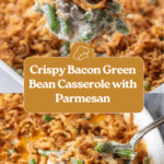 Keywords: green bean casserole, holiday side dish, bacon green beans, creamy casserole, mushroom sauce, parmesan cheese, French fried onions, easy baked casserole