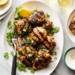 Keywords: za’atar chicken, grilled chicken, Middle Eastern chicken recipe, garlic yogurt sauce, cilantro, healthy grilled chicken, marinated chicken thighs