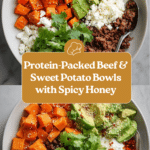 These High-protein Beef & Sweet Potato Bowls combine tender, flavorful beef mince with sweet, caramelized roasted sweet potatoes, creamy avocado, and cottage cheese, all brought together with a spicy-sweet hot honey drizzle. This wholesome and satisfying dish balances protein, healthy fats, and complex carbs for a nutrient-packed meal perfect for lunch or dinner.