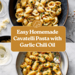 This Homemade Cavatelli recipe guides you through making traditional Italian pasta from scratch using semolina flour and water, then tossing it in a flavorful garlic chili oil sauce finished with Pecorino Romano cheese. The tender cavatelli are shaped by hand, cooked until they float, and coated in a creamy, spicy oil-based sauce that’s both simple and satisfying.