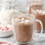 A clear glass mug filled with light brown hot chocolate topped with a layer of white small marshmallows floating on the surface; the mug sits on a white marbled texture with scattered white mini marshmallows and red-and-white striped peppermint candies around it, while a white bowl filled with red-and-white peppermint candies and a jar of brown powder are blurred in the soft background. photo taken with an iphone --ar 4:5 --v 7