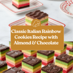 Italian Rainbow Cookies are a festive treat featuring layers of almond-flavored cake colored in red, green, and plain, sandwiched with apricot jam and coated in smooth chocolate. These vibrant and delicious cookies are a perfect addition to holiday gatherings or special occasions.
