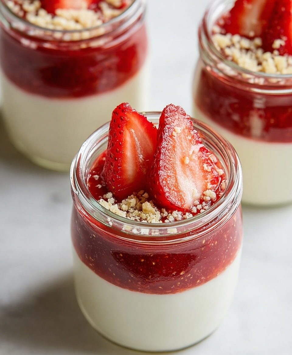 - Assemble the Jars: Start by layering the almond crumb base at the bottom of your serving jars, reserving a small amount for topping. Add the creamy filling next, smoothing it out. Spoon the cooled strawberry compote over the filling layer. Finish with the remaining crumb base on top, and garnish with fresh strawberries for presentation.