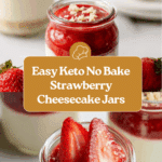 Delicious and easy-to-make Keto No Bake Strawberry Cheesecake Jars that are perfect for a low-carb dessert option. These jars feature a rich almond crumb base, creamy mascarpone and cream cheese filling, and a fresh, homemade strawberry compote topping. Quick to prepare and perfect for individual servings, these jars satisfy sweet cravings while keeping carbs low.