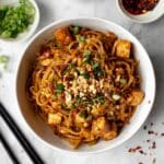 A white bowl filled with thick, brown noodles mixed with golden-brown chunks of tofu, all coated in a glossy sauce. On top, there is a sprinkle of chopped green onions, crushed peanuts, and small red chili flakes, giving a textured and colorful finish. Around the bowl on a white marbled surface, there are small white dishes filled with chopped green onions and additional chili flakes, along with some scattered peanuts and chili flakes near a pair of black chopsticks. photo taken with an iphone --ar 4:5 --v 7