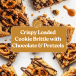 Keywords: cookie brittle, chocolate chip cookie brittle, loaded cookie brittle, sweet and salty dessert, caramel drizzled brittle, crunchy cookie treat