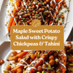 This Maple Sweet Potato Salad is a delightful blend of tender roasted sweet potatoes, crispy spiced chickpeas, and a creamy whipped tahini yogurt sauce. Enhanced with a spicy maple drizzle and toasted pistachios, it’s a vibrant, satisfying dish perfect as a side or light meal.
