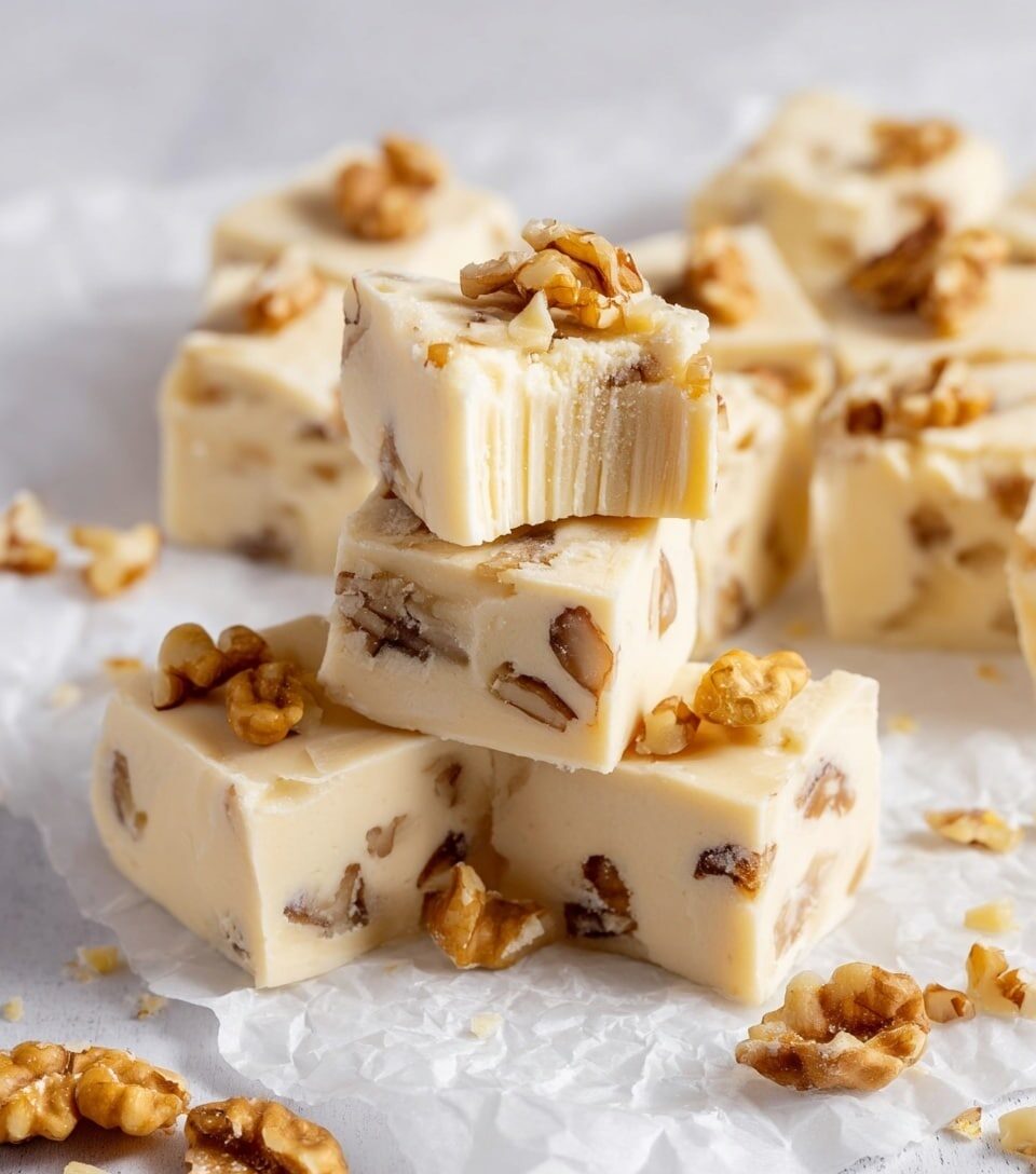 Keywords: maple walnut fudge, white chocolate fudge, easy fudge recipe, no bake fudge, holiday fudge, sweet treat