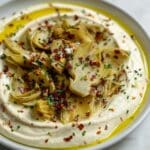 This Marinated Artichokes recipe features tender baby artichokes simmered in lemon water, then marinated in a flavorful blend of caramelized lemon, garlic, herbs, white wine, and spices. The marinated artichokes are served warm atop a creamy whipped brie and cream cheese spread, making for a vibrant and elegant appetizer. Perfect with crusty bread, this dish balances bright citrus, mild heat, and rich creaminess in every bite.