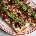 This Mortadella Tartine with Stracciatella & Pistachio is a delightful combination of creamy cheese, nutty sauce, and savory seared mortadella on crusty baguette. It’s a fresh, elegant appetizer or light meal that’s sure to impress with its balance of rich and bright flavors.