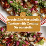 Keywords: Mortadella tartine, stracciatella cheese, pistachio sauce, seared mortadella, Italian appetizer, open-faced sandwich, elegant brunch recipe