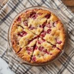 A round, sliced cake is shown from above, baked in a clear glass pie dish with two small handles on the sides. The cake has a golden-brown crust with uneven patches of red fruit spread throughout the top layer, giving it a marbled look. The surface looks crumbly and slightly cracked, with the red fruit filling visibly peeking through. The dish sits on a checkered cloth with beige and dark blue stripes. The background is a white marbled texture made to look like a wooden table. photo taken with an iphone --ar 4:5 --v 7