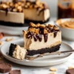 - Remove and garnish: Carefully run a butter knife along the edges of the springform pan to loosen the pie. Release the sides of the pan and transfer the pie to a serving plate. Decorate with drizzled melted chocolate, mini peanut butter cups, and peanut butter chips as desired.