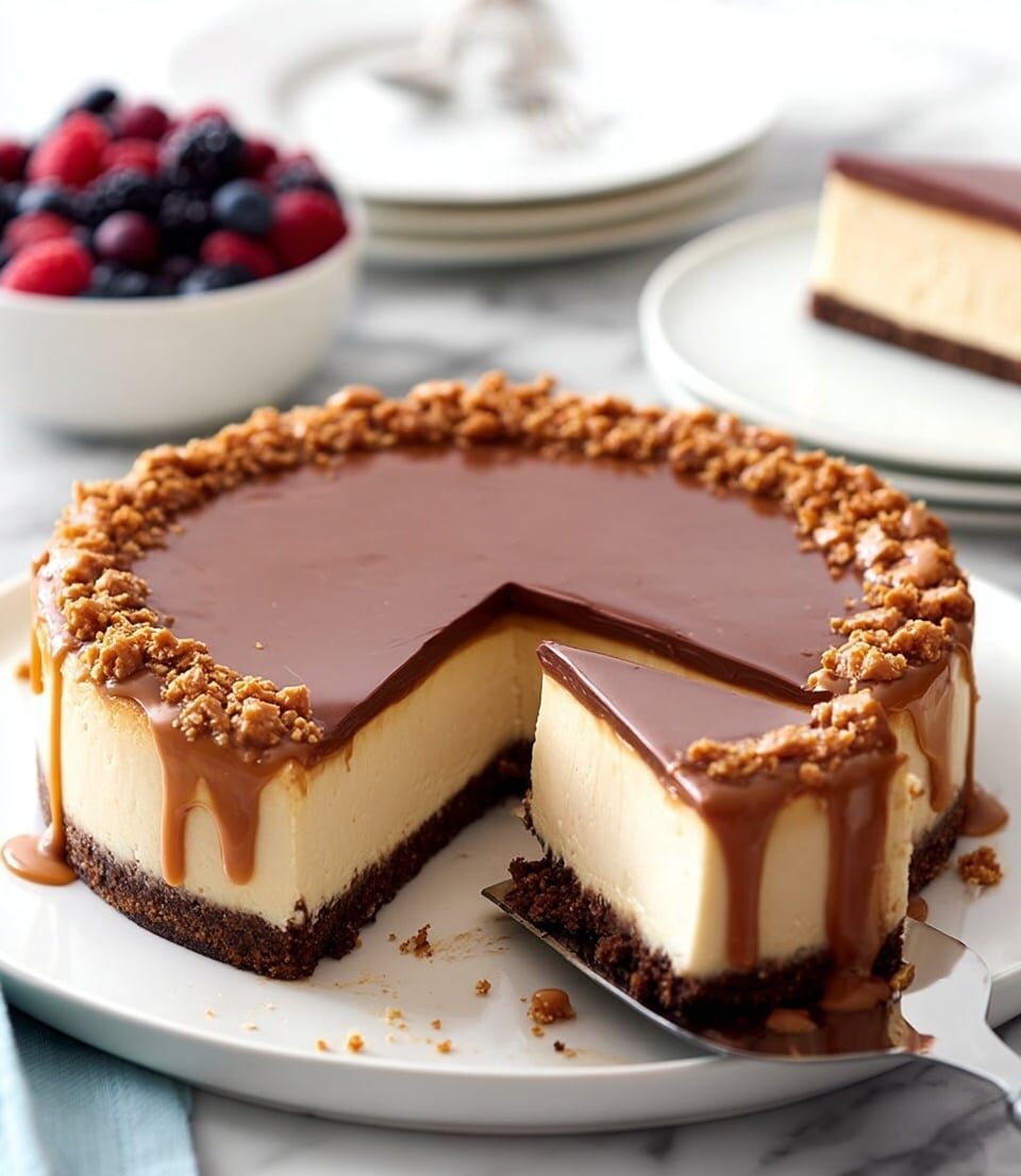 Store the cheesecake covered in the refrigerator for up to 5 days to keep it fresh and creamy. For longer storage, freeze the cheesecake wrapped tightly in plastic wrap and aluminum foil for up to one month. Thaw overnight in the refrigerator before serving. When reheating the topping drizzle, gently warm to fluid again if needed.