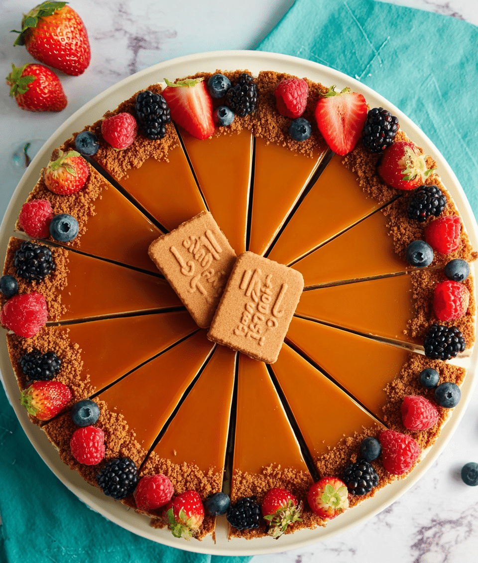 - Prepare the topping and serve: Remove the cheesecake from the springform pan carefully, using a knife to loosen the edges, then lift off the base with the parchment. Warm the remaining 140g Lotus Biscoff spread in a microwave-safe bowl for about 40 seconds until fluid. Using a piping bag or a snipped zipper lock bag, drizzle melted spread around the edges for a drip effect, then pour and smooth the rest over the top. Chill again for at least 10 minutes to set the topping. Sprinkle the reserved cookie crumbs around the sides and decorate with 2 Lotus cookies on top. For neat slices, dip a sharp knife in hot water, wipe dry, and slice, cleaning the knife between cuts. Optionally garnish with fresh berries and serve chilled. Store leftovers covered in the fridge for up to 5 days or freeze for up to a month.