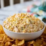 This Out-of-this-World Corn Dip is a flavorful and creamy blend of MexiCorn, green chiles, jalapenos, and sharp cheddar cheese, perfect for parties or gatherings as a zesty dip paired with crunchy Fritos Scoops corn chips.