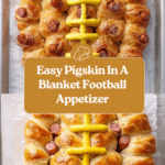Pigskin In A Blanket is a fun, crowd-pleasing snack perfect for game day or casual gatherings. Mini hot dogs wrapped in flaky crescent rolls become a delicious football-shaped treat that’s as tasty as it is festive.