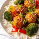 This dish shows four golden-brown meatballs covered with shiny orange glaze and sprinkled with white sesame seeds, arranged loosely in the center. They sit on a bed of white rice, which forms the bottom layer with fluffy texture. Around and under the meatballs, there are bright green broccoli florets and pieces of red bell pepper, adding fresh and colorful contrast. Small slices of green onion are scattered on top, offering a fresh green touch. All of this is placed on a round white plate, and the background is a white marbled surface. Photo taken with an iphone --ar 4:5 --v 7