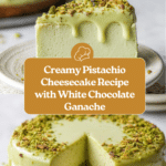 This rich and creamy Pistachio Cheesecake features a luscious homemade pistachio paste blended into the filling, baked atop a buttery graham cracker crust, and finished with a smooth white chocolate pistachio ganache. Perfectly nutty and decadently creamy, it’s an impressive dessert that balances mild sweetness with the distinctive flavor of pistachios.
