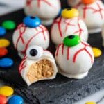 6. Decorate the eyeballs: Use the tube of red decorating gel to draw 4–5 thin, squiggly lines from the center of each truffle to create a “vein” effect on the eyeballs. Use the tube of black decorating gel to draw a pupil onto the center of each M&M.