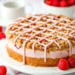 This Raspberry Rose Coffee Cake offers a beautiful blend of tart raspberries and delicate rose water in a moist, tender cake. With a creamy cheesecake layer and crunchy cinnamon streusel topping, it’s a perfect treat for breakfast or afternoon tea.