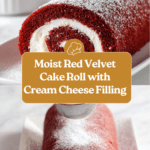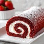 Keywords: Red velvet cake roll, jelly roll cake, cream cheese filling, whipped cream filling, holiday dessert, rolled cake recipe